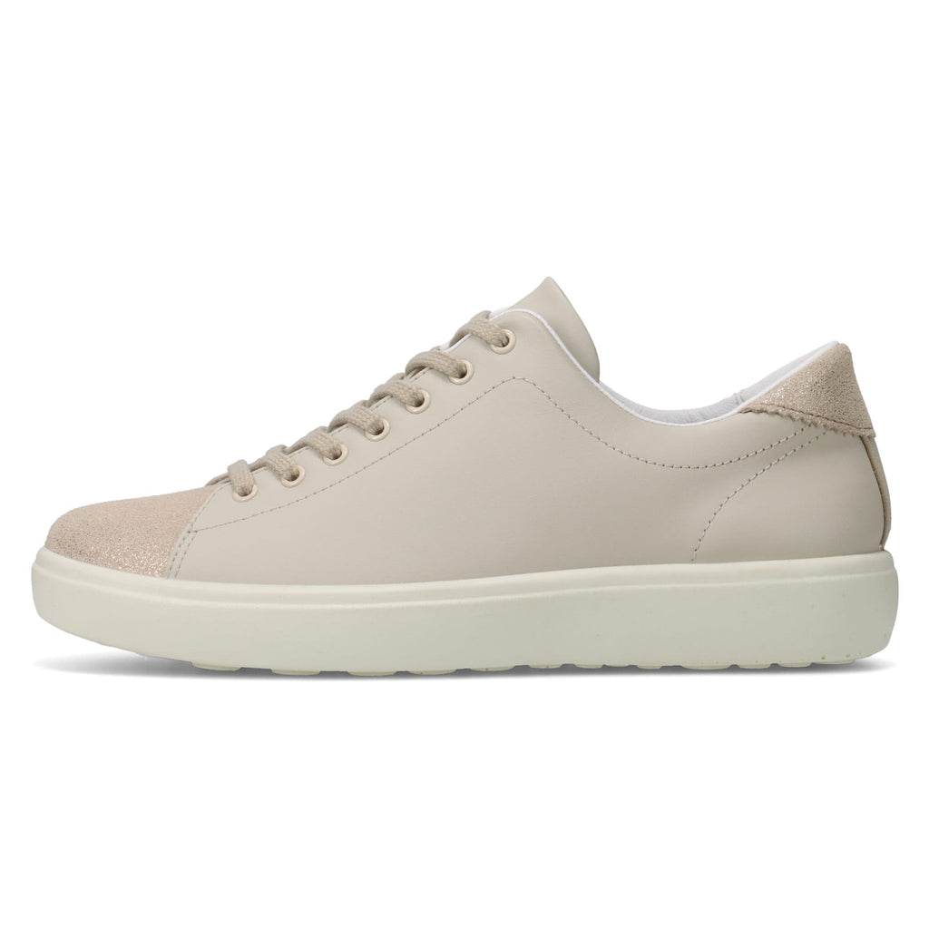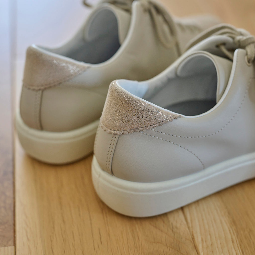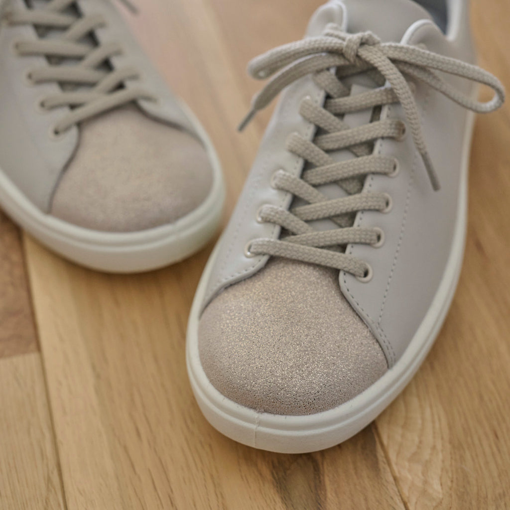 つま先とかかと部分には、上品にきらめくラメ革を使用。シンプルな中にも華やかさがあり、足元を軽やかに見せてくれます。
