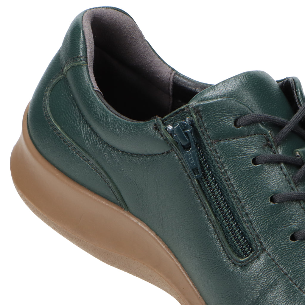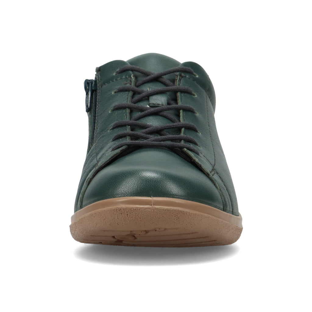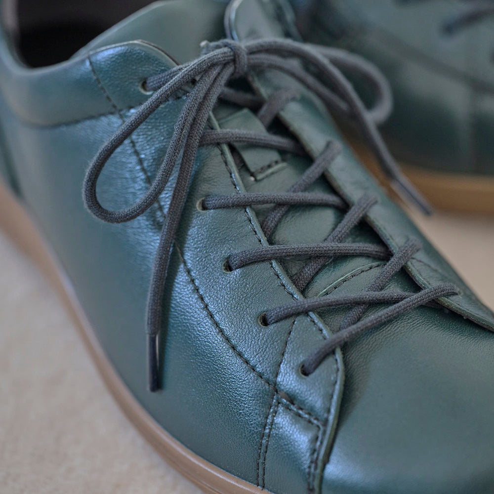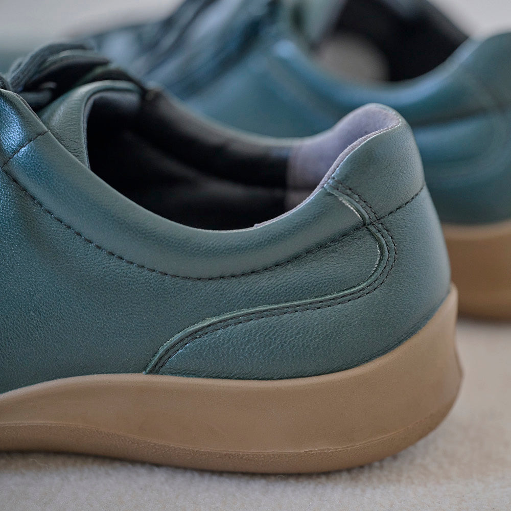 羊革で足あたりがとても柔らかいです。紐(外羽根タイプ)なので足に合わせて調整がしやすく、足幅の広い方、外反母趾の方には特にお勧め。ファスナー付きで着脱も楽です。