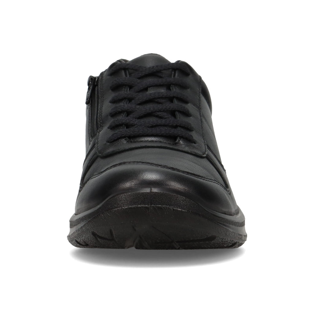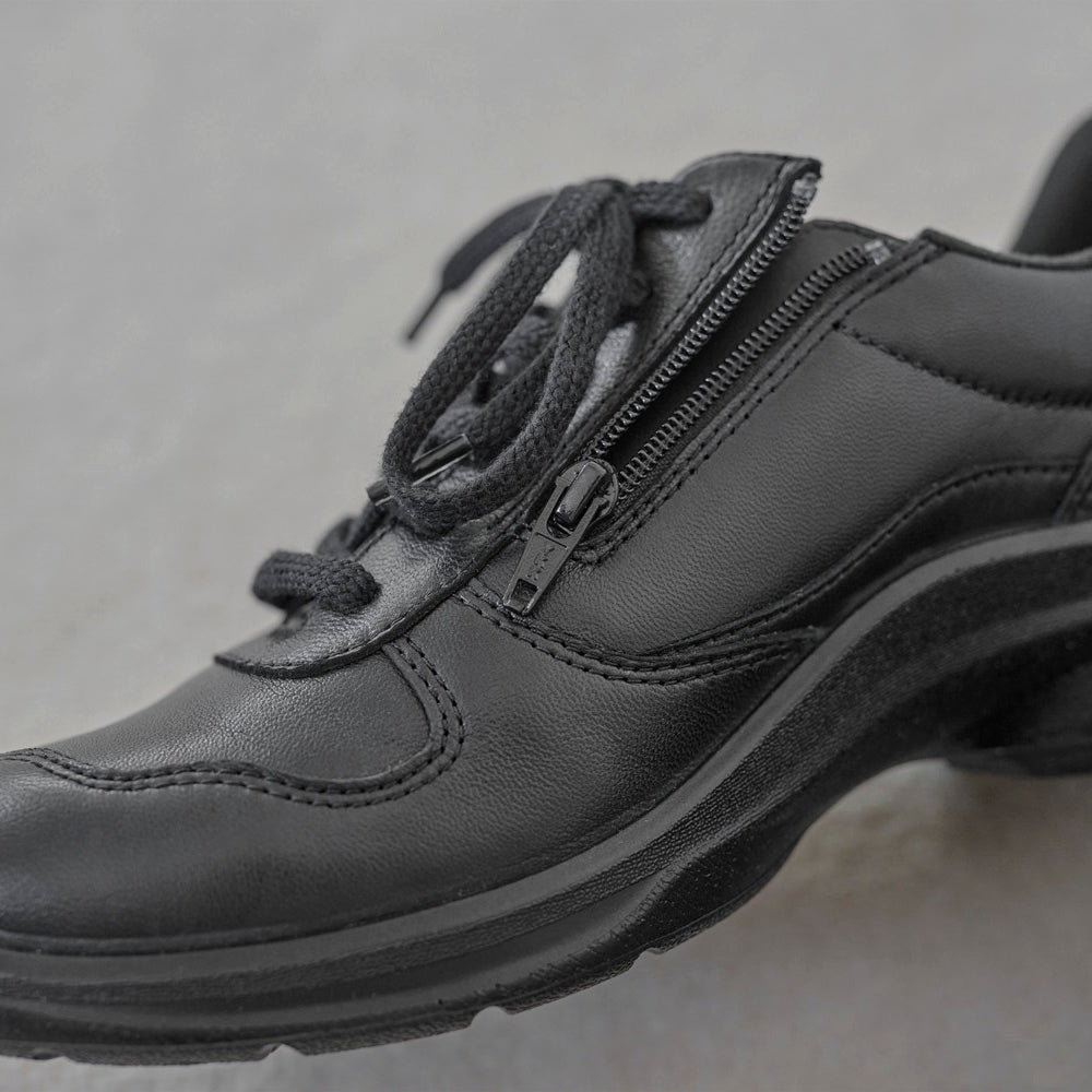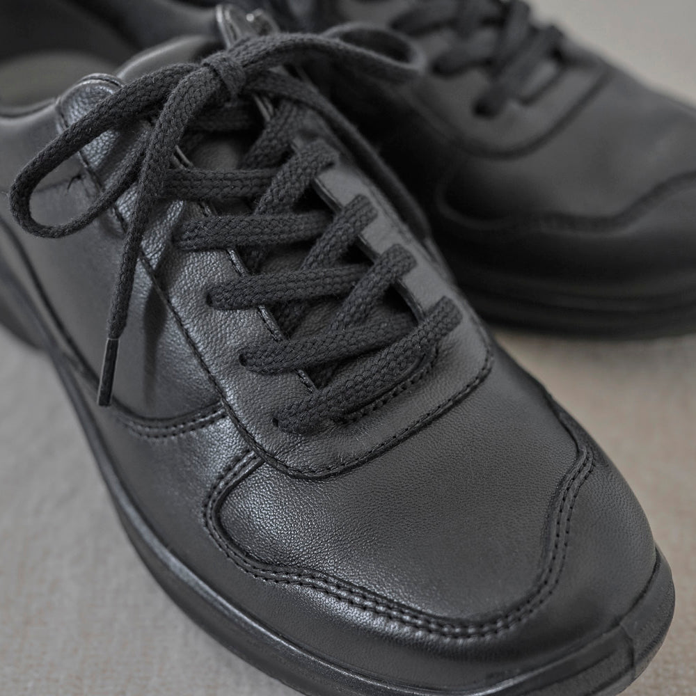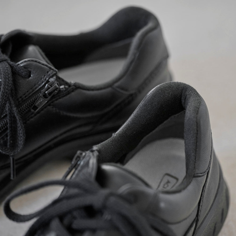 さらに内側ファスナー付きなので、紐を結び直さずにスムーズに脱ぎ履きできます。ライニングと履き口にはウレタンを内蔵し、足あたりもやさしく設計。ヒール高約4cmの少し厚めのソールが、さりげなくスポーティーな印象を添え、ウォーキングやタウンユースなど幅広いシーンで活躍します。撥水加工を施しているため、突然の雨でも安心。外反母趾の方にもおすすめの、大人の女性のための3Eスニーカーです。