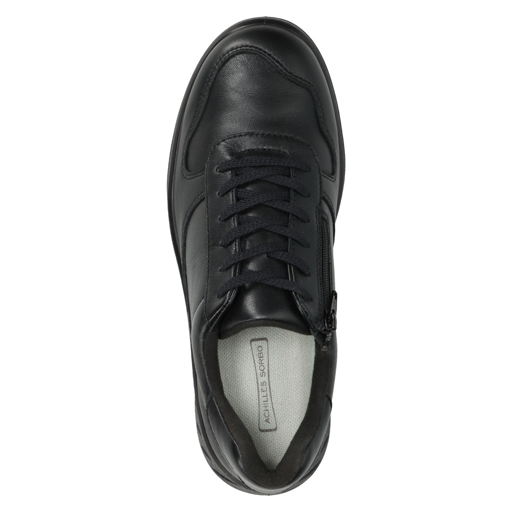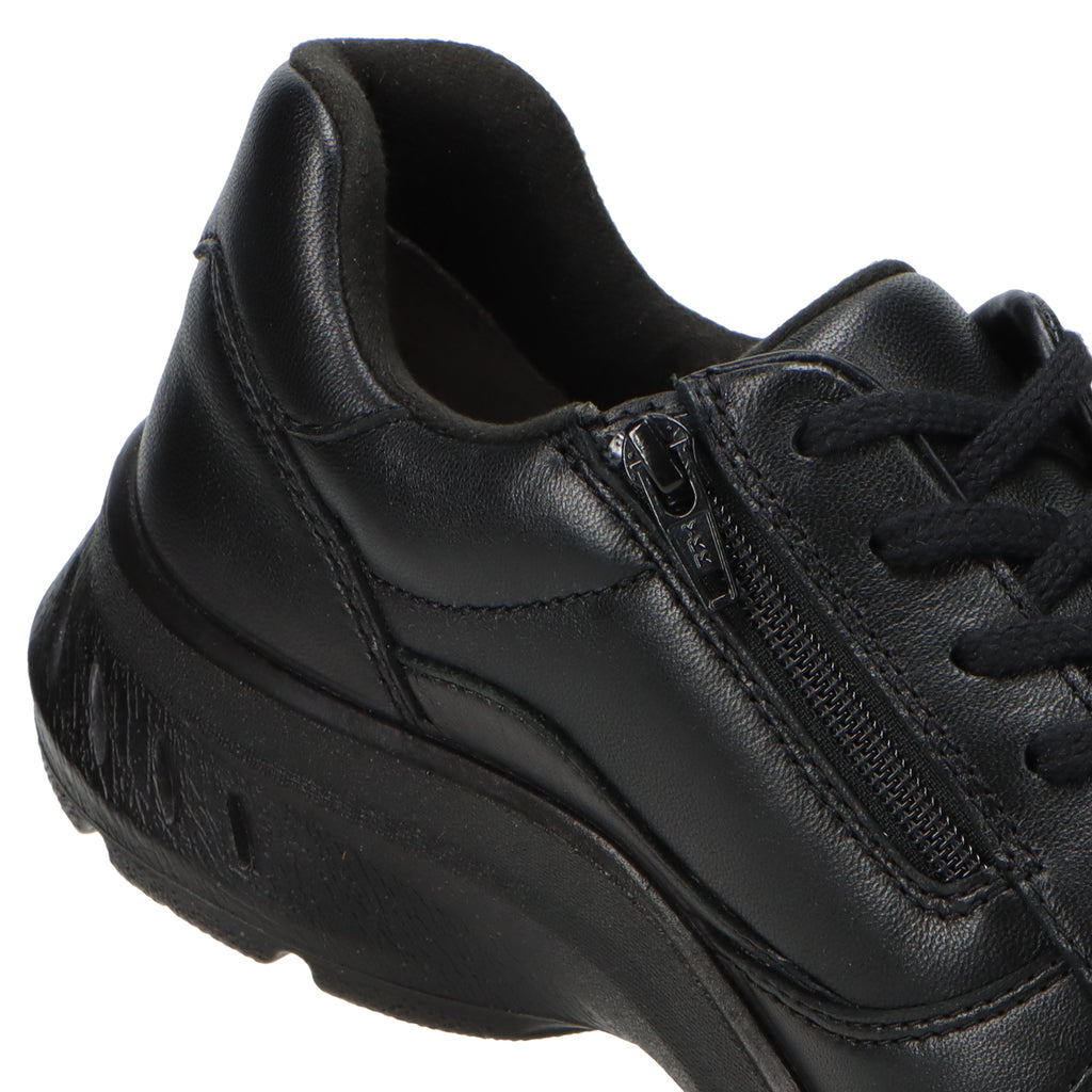 レザースニーカー。羊革で足あたりはかなり柔らかく、幅広甲高さんも楽にお履きいただけます。足を入れると包み込まれるような感覚です。革は撥水加工もされているので、急な雨でも対応できます。着脱が楽なファスナー付き。しかも内側についているので、デザインの邪魔をしません。
