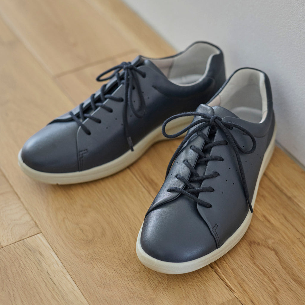 上品な印象のレースアップスニーカー。シンプルなデザインにパンチング加工を施し、軽やかさを添えました。ドッグイヤー形状のかかとが足をしっかりホールドし、丸紐でカジュアルすぎずスタイリッシュに履けます。つま先にかけて少し細くなったシルエットは、指の長い方にもフィット感◎。スッキリと見えて、履くとゆったりとした快適な履き心地。デイリーからオフィスカジュアルまで幅広く活躍します。