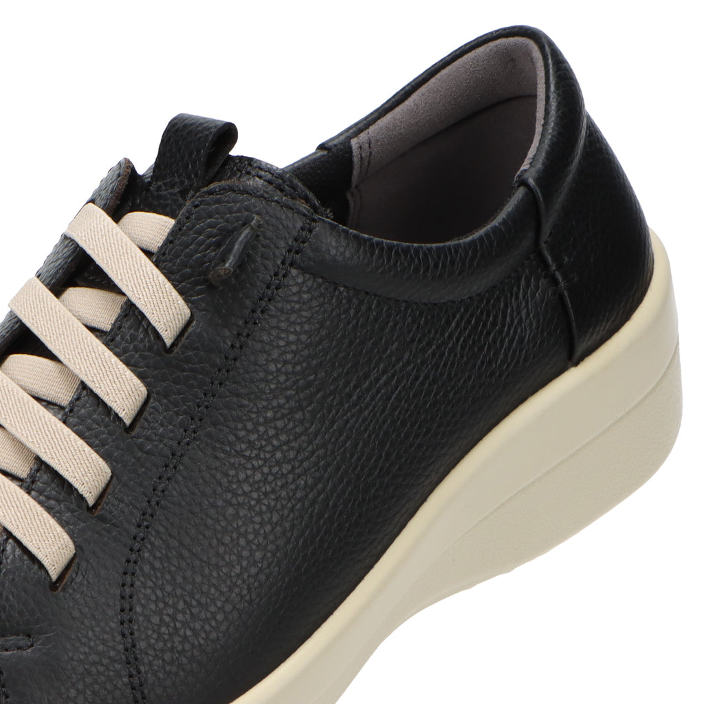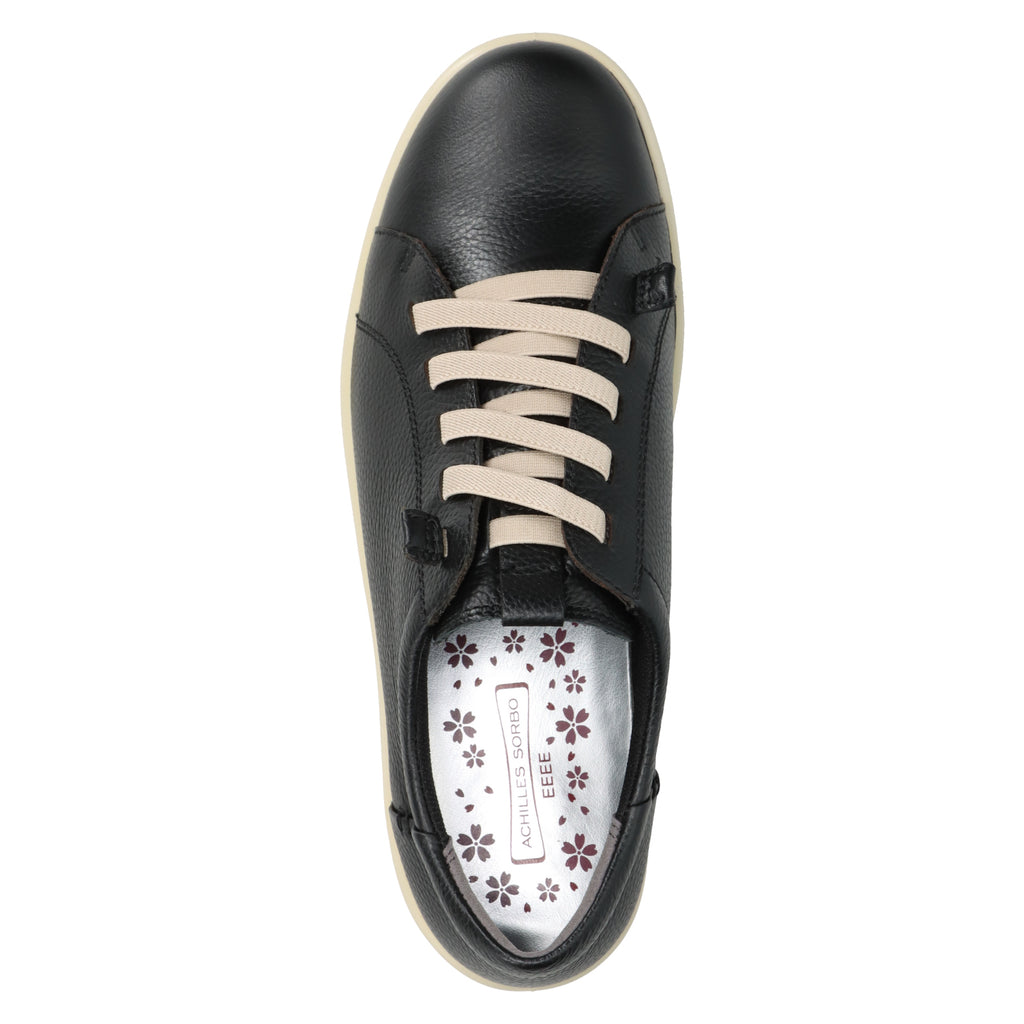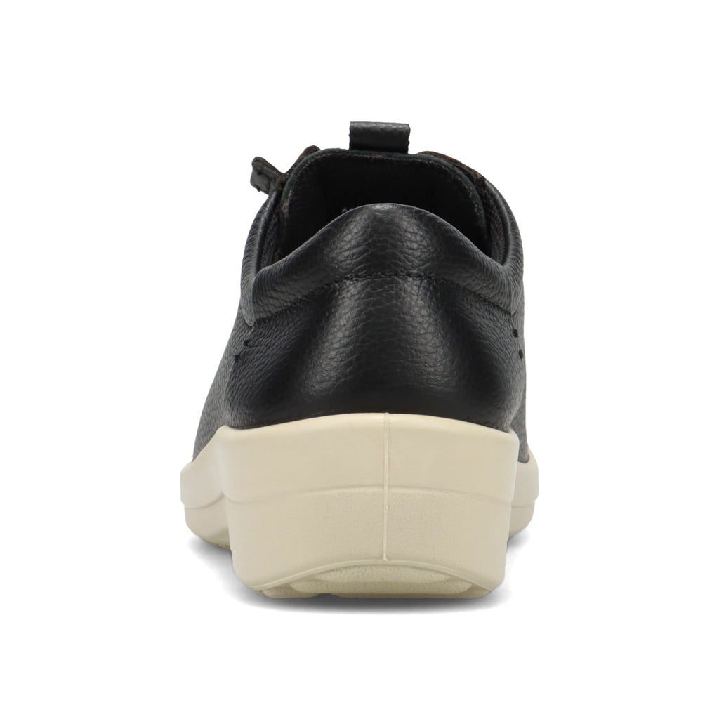 甲にはアキレス・ソルボで人気のゴム紐デザインを採用。脱ぎ履きがしやすく、太めのゴム紐がさりげないアクセントにもなっています。ゆったりとした4E木型で、幅広の方や甲高の方にもおすすめ。牛革ならではの柔らかさが足になじみ、日常使いしやすい一足です。