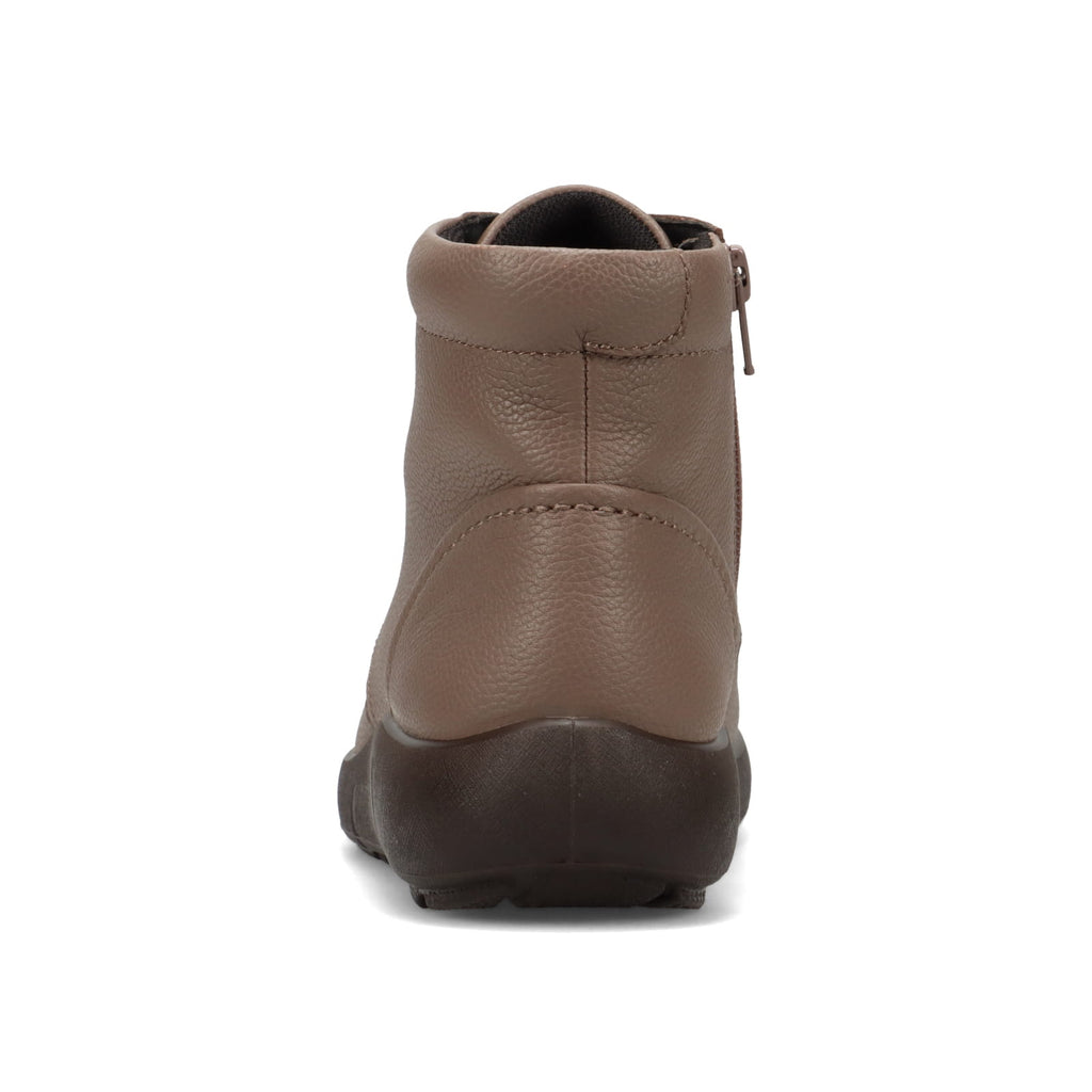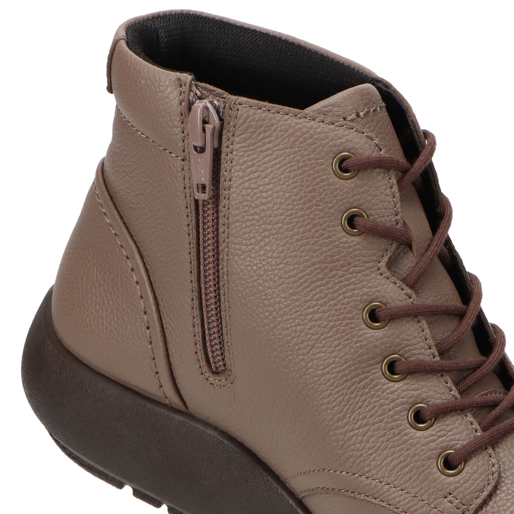 つま先は丸みのあるオブリーク形状で、やさしい印象に。履き口にはウレタンを内蔵し、足当たりもやわらか。内側ファスナー付きで、着脱もスムーズです。