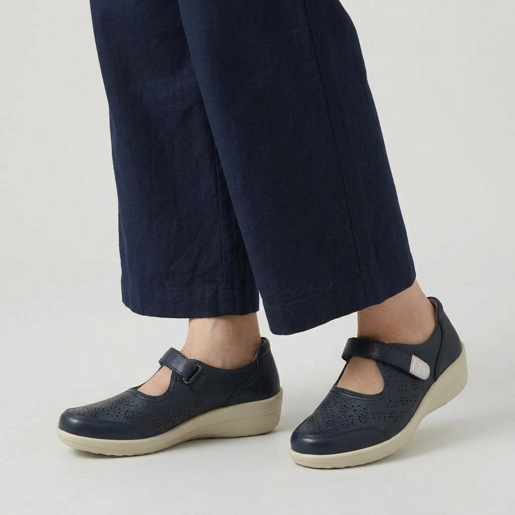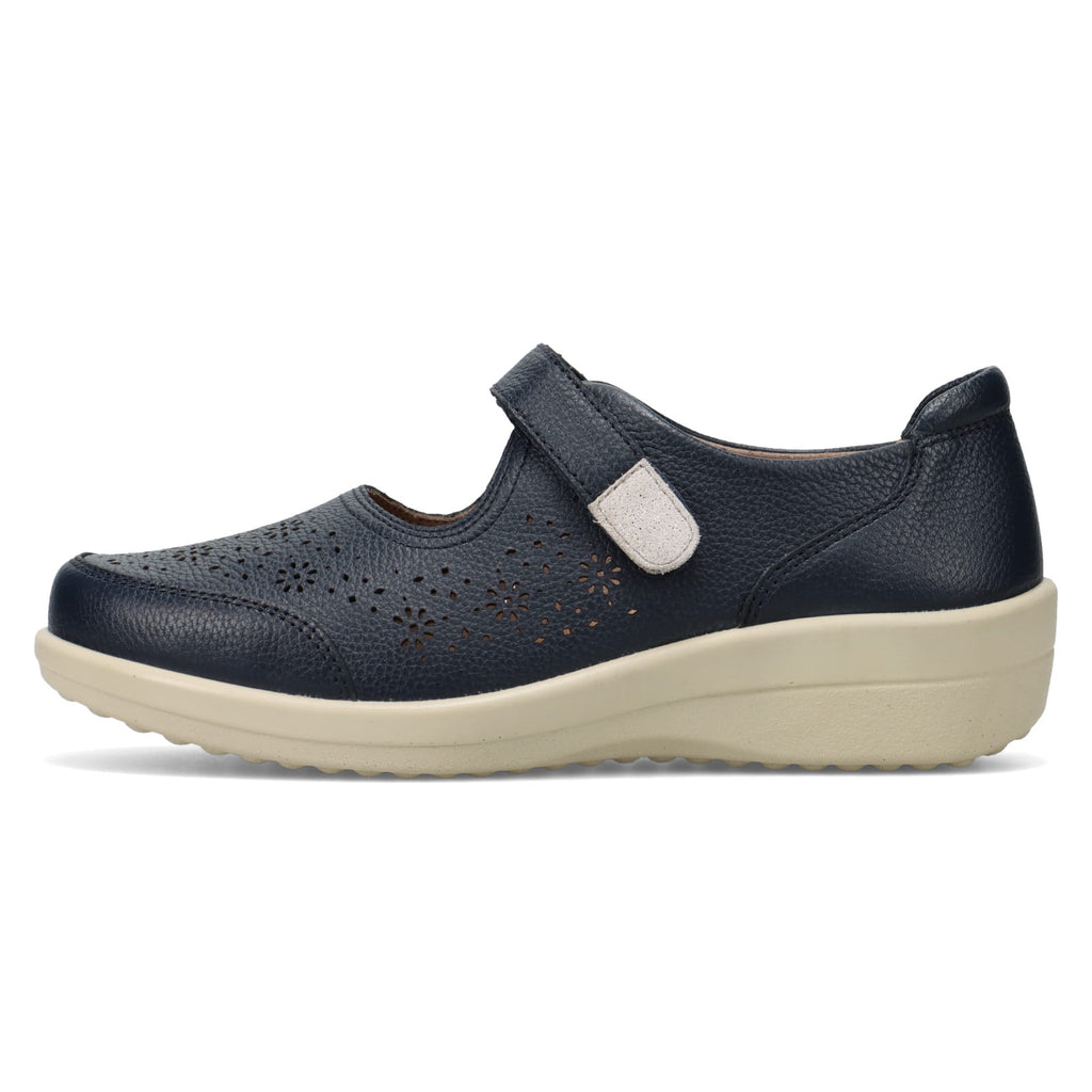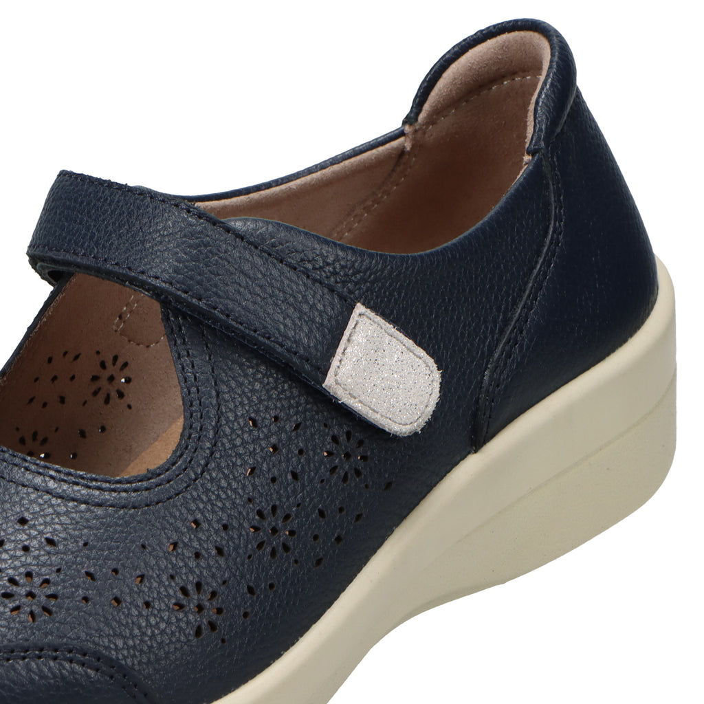 涼しげな花柄パンチングが、足もとにやさしい印象を添えるストラップシューズです。