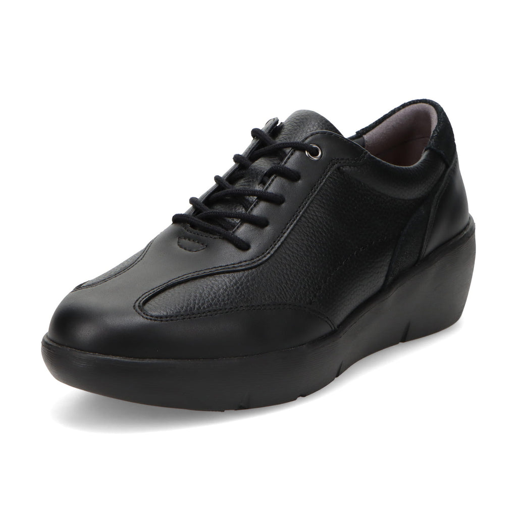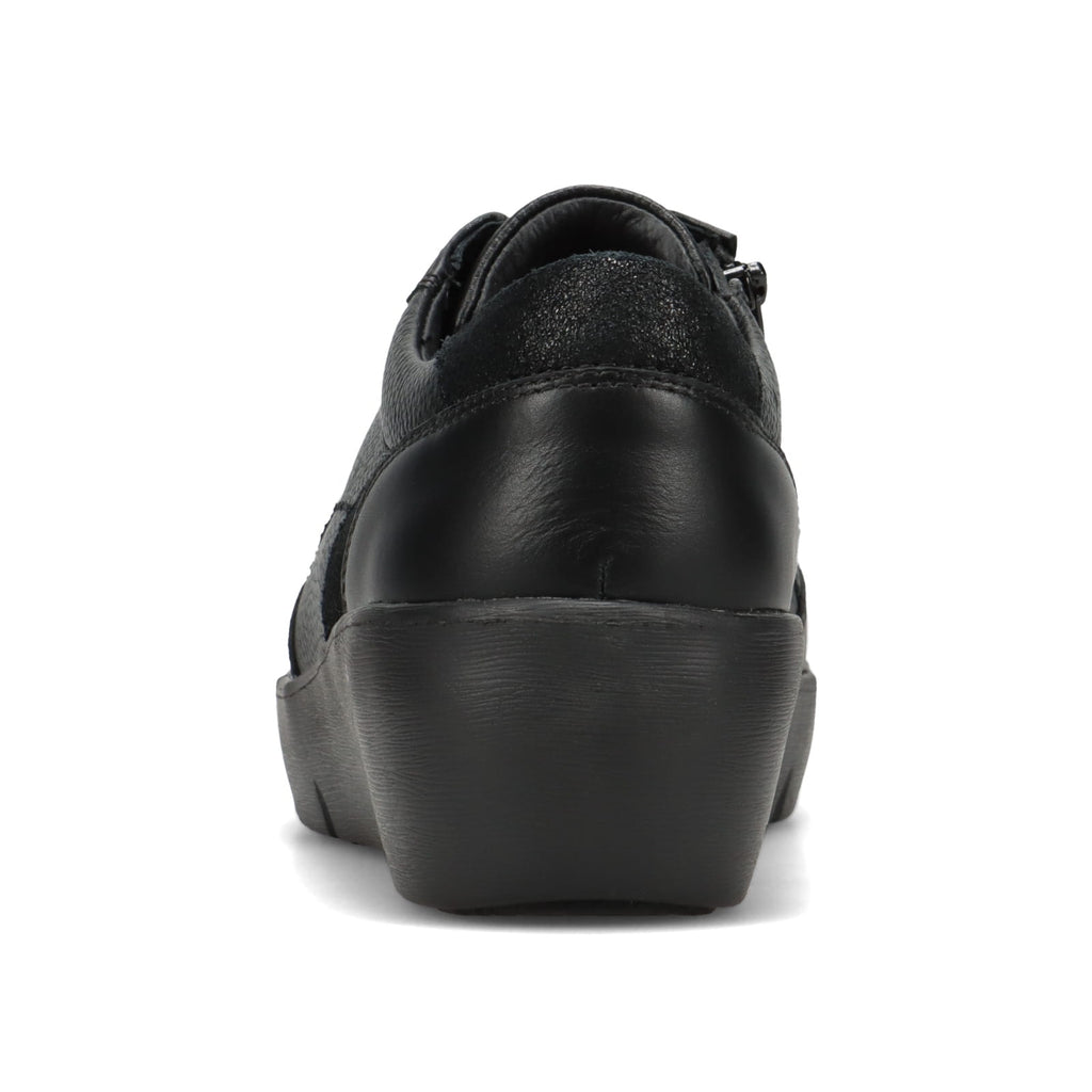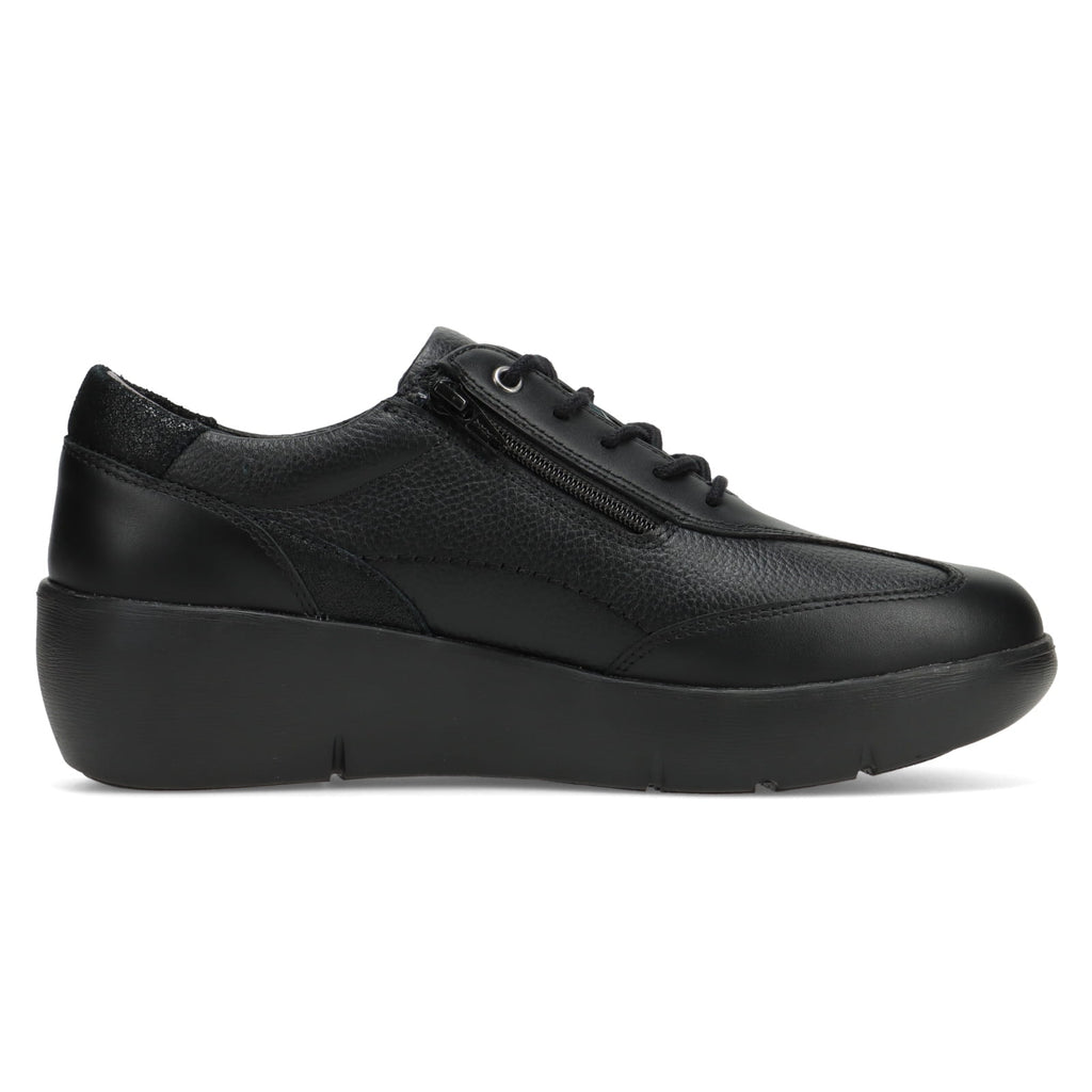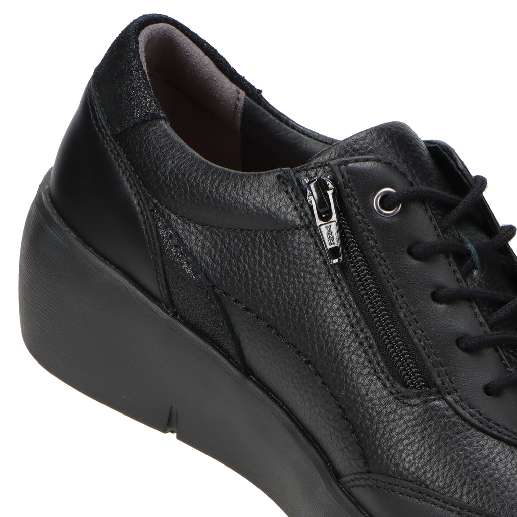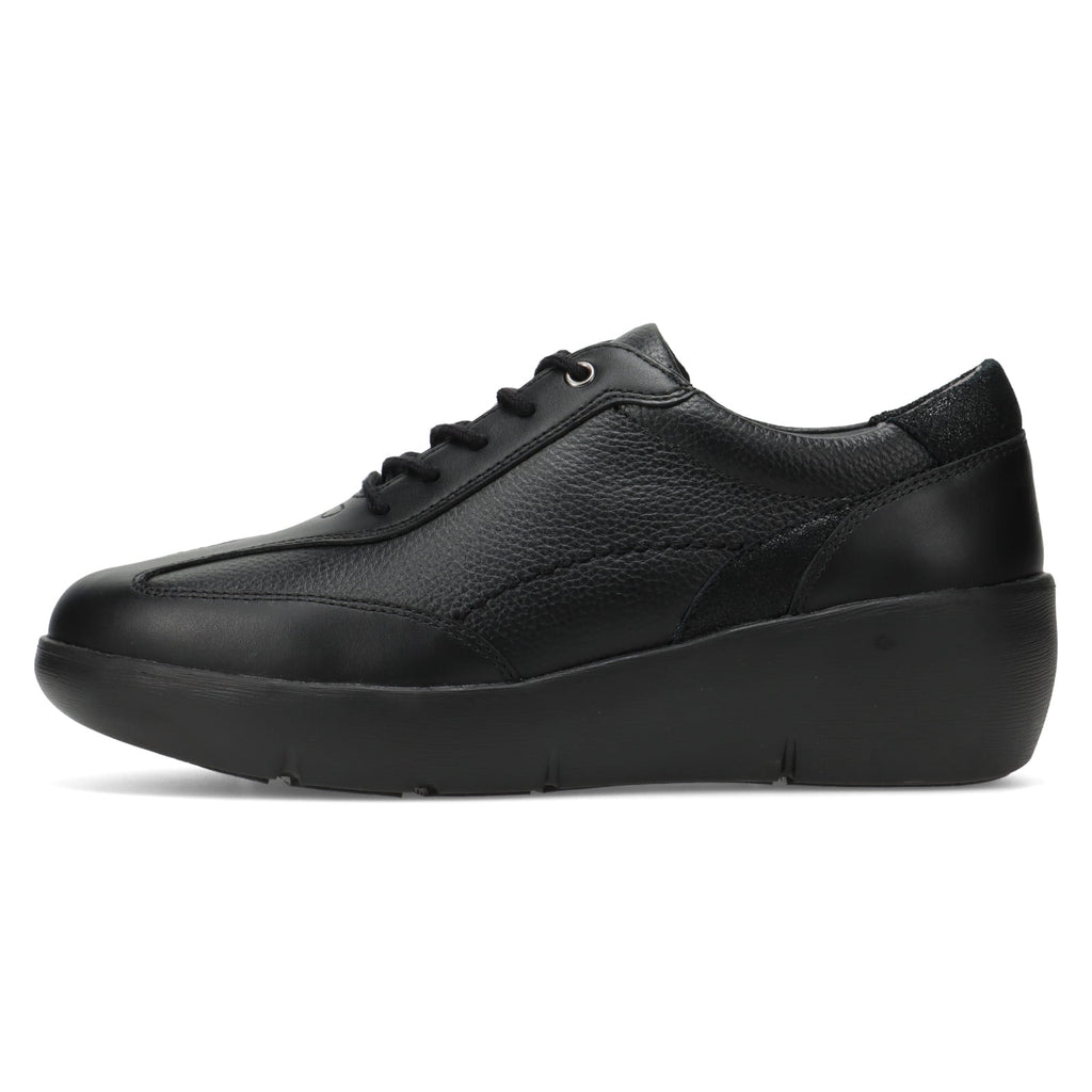 流線形のパターンが描くやわらかなシルエットに、きらりと光るラメ革と金具のアクセント。見た目の華やかさと実用性を兼ね備えた、大人のための厚底レースアップシューズです。内側ファスナーで脱ぎ履きがしやすく、細身に見えるデザインはパンツにもスカートにも好相性。ウェッジソールでつま先とかかとの高低差が少なく、歩行もスムーズ。大人カジュアルに、ほんのり上品さを添える一足です。