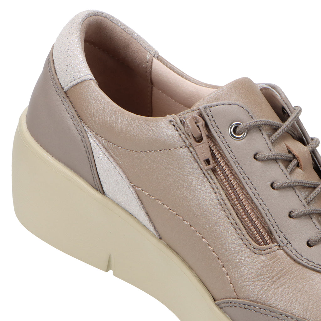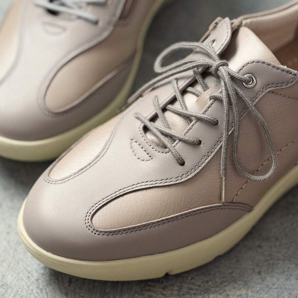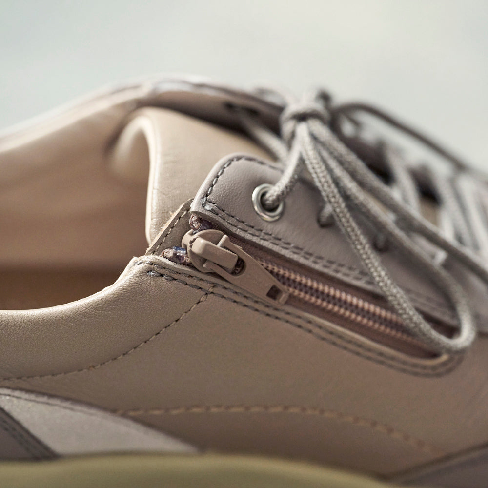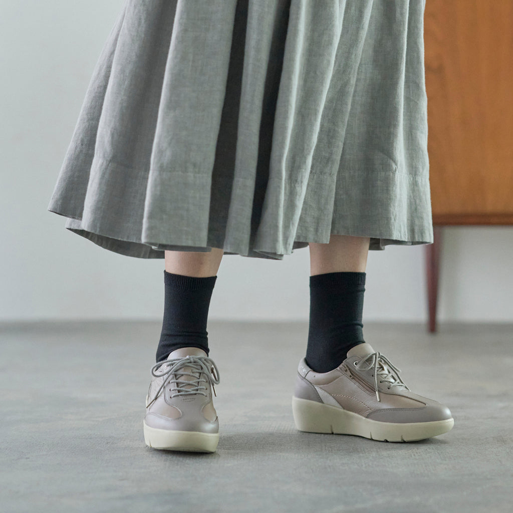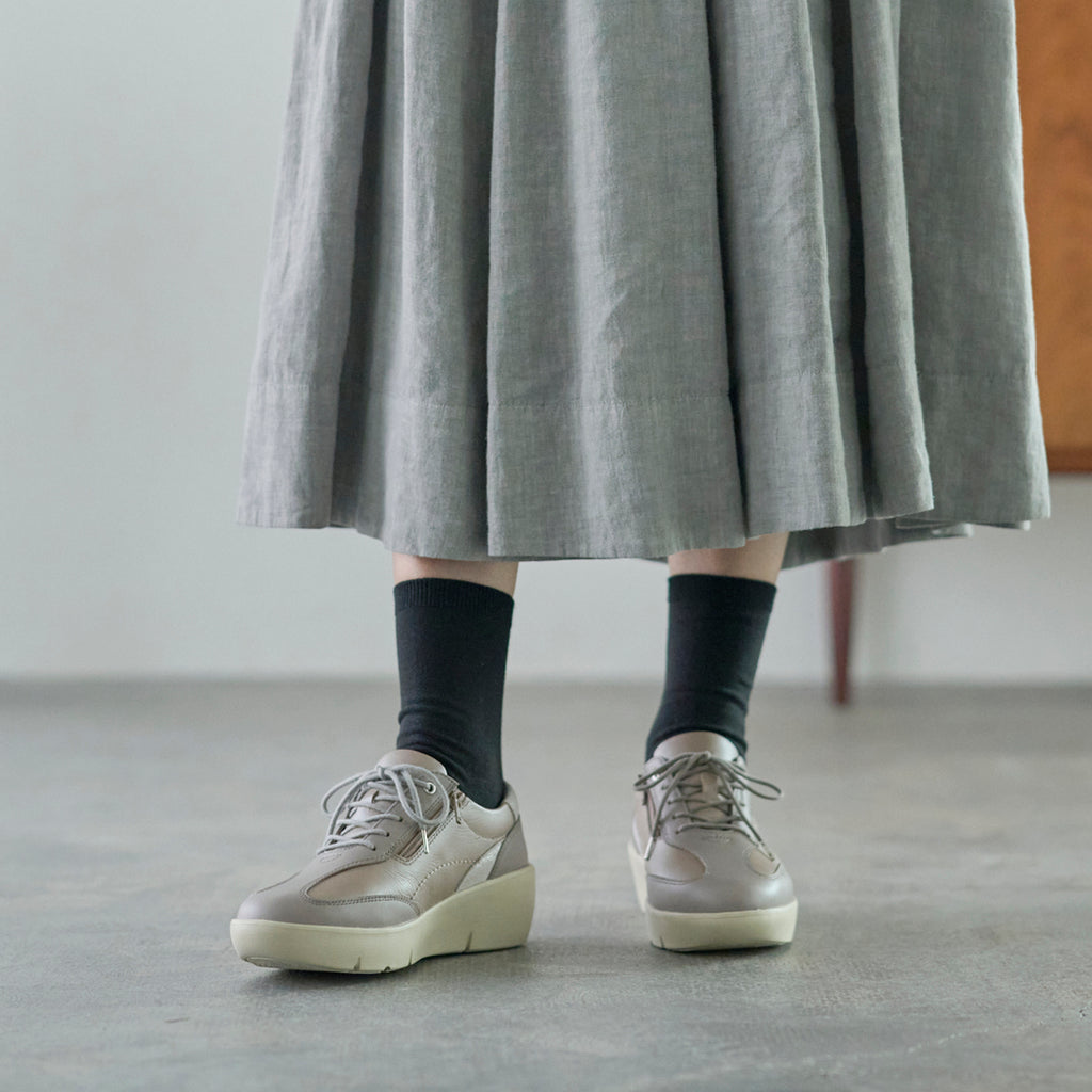 流線形のパターンが描くやわらかなシルエットに、きらりと光るラメ革と金具のアクセント。見た目の華やかさと実用性を兼ね備えた、大人のための厚底レースアップシューズです。内側ファスナーで脱ぎ履きがしやすく、細身に見えるデザインはパンツにもスカートにも好相性。ウェッジソールでつま先とかかとの高低差が少なく、歩行もスムーズ。大人カジュアルに、ほんのり上品さを添える一足です。
