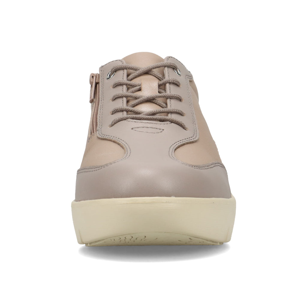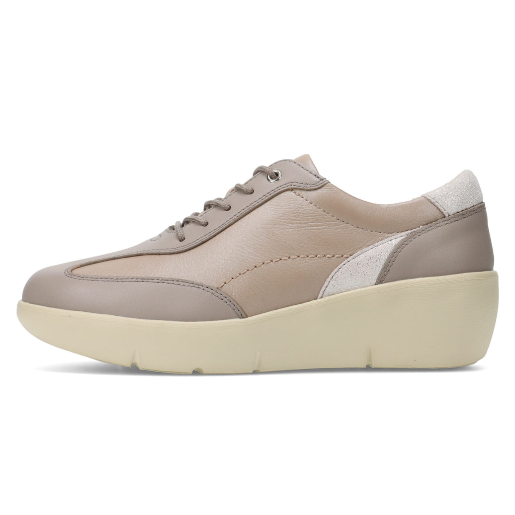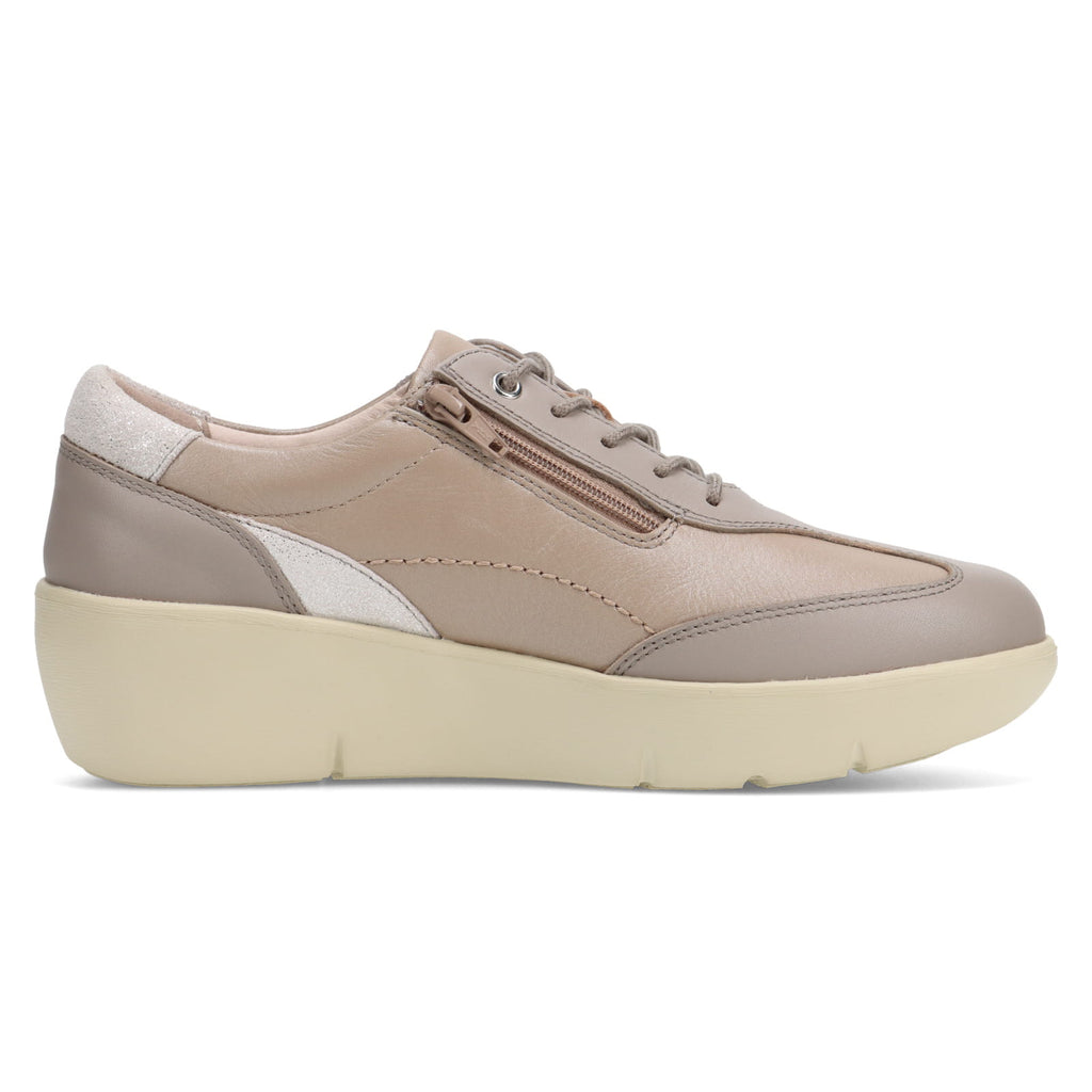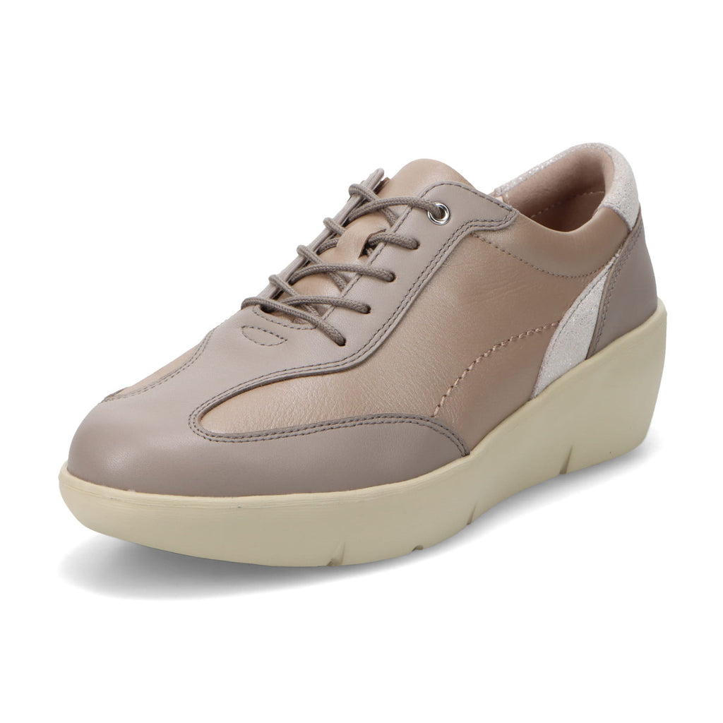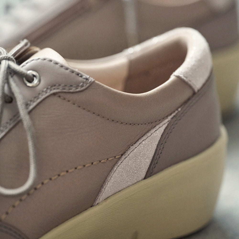 流線形のパターンが描くやわらかなシルエットに、きらりと光るラメ革と金具のアクセント。見た目の華やかさと実用性を兼ね備えた、大人のための厚底レースアップシューズです。内側ファスナーで脱ぎ履きがしやすく、細身に見えるデザインはパンツにもスカートにも好相性。ウェッジソールでつま先とかかとの高低差が少なく、歩行もスムーズ。大人カジュアルに、ほんのり上品さを添える一足です。
