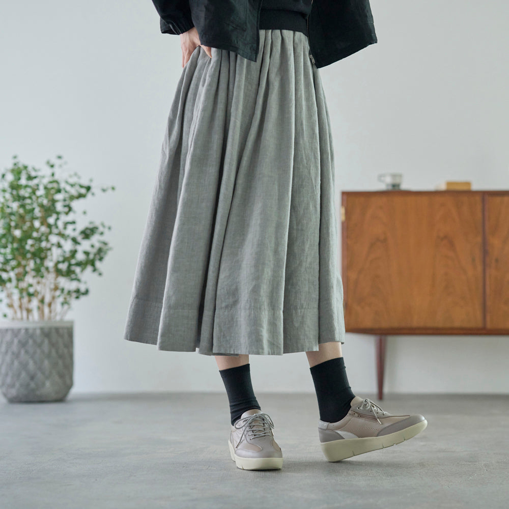 細身に見えるデザインで、パンツにもスカートにもマッチ。