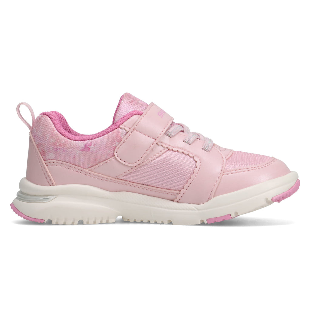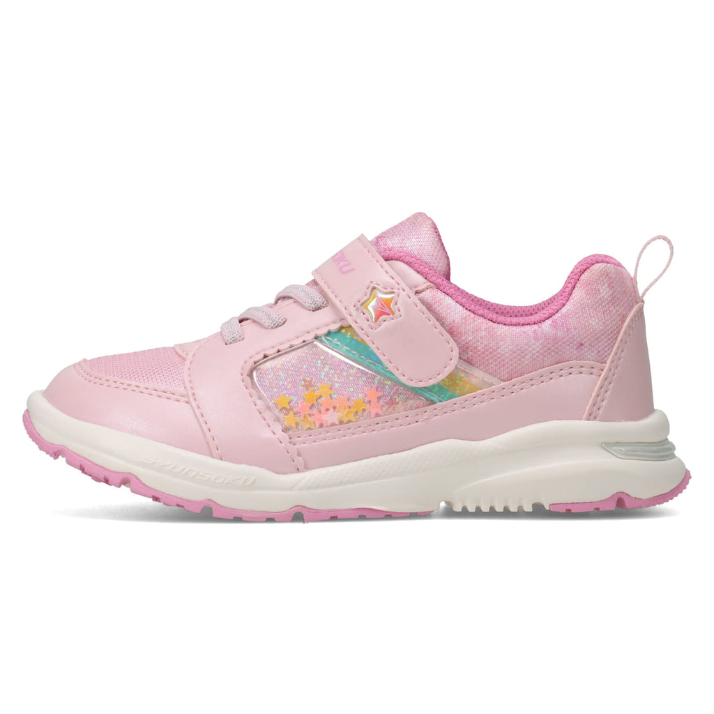 注目はアッパー側面に散りばめられた星が揺れるクリアケース。走るたびに星が動き、遊び心あふれるデザインが魅力です。さらに、甲をとめるバンド部分にも星のデザインをあしらい、細部まで見た目にこだわりました。