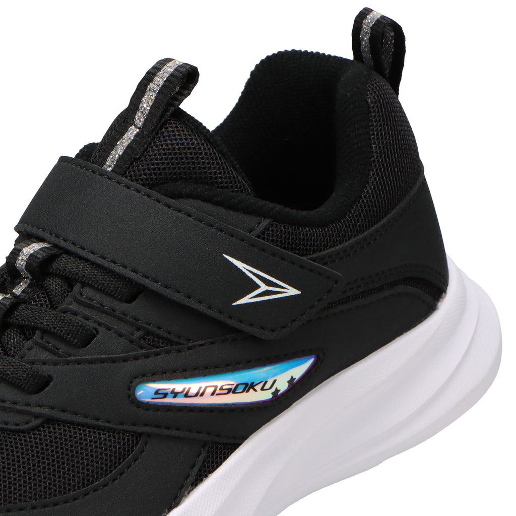 注目ポイントは、シューレースホルダーと踵のつまみに施されたシルバーのラメ加工。見る角度によってきらめきが変わり、華やかさを演出します。さらに、アッパーサイドにはホログラムのSYUNSOKUロゴを配置し、シンプルなデザインの中におしゃれなアクセントを加えました。