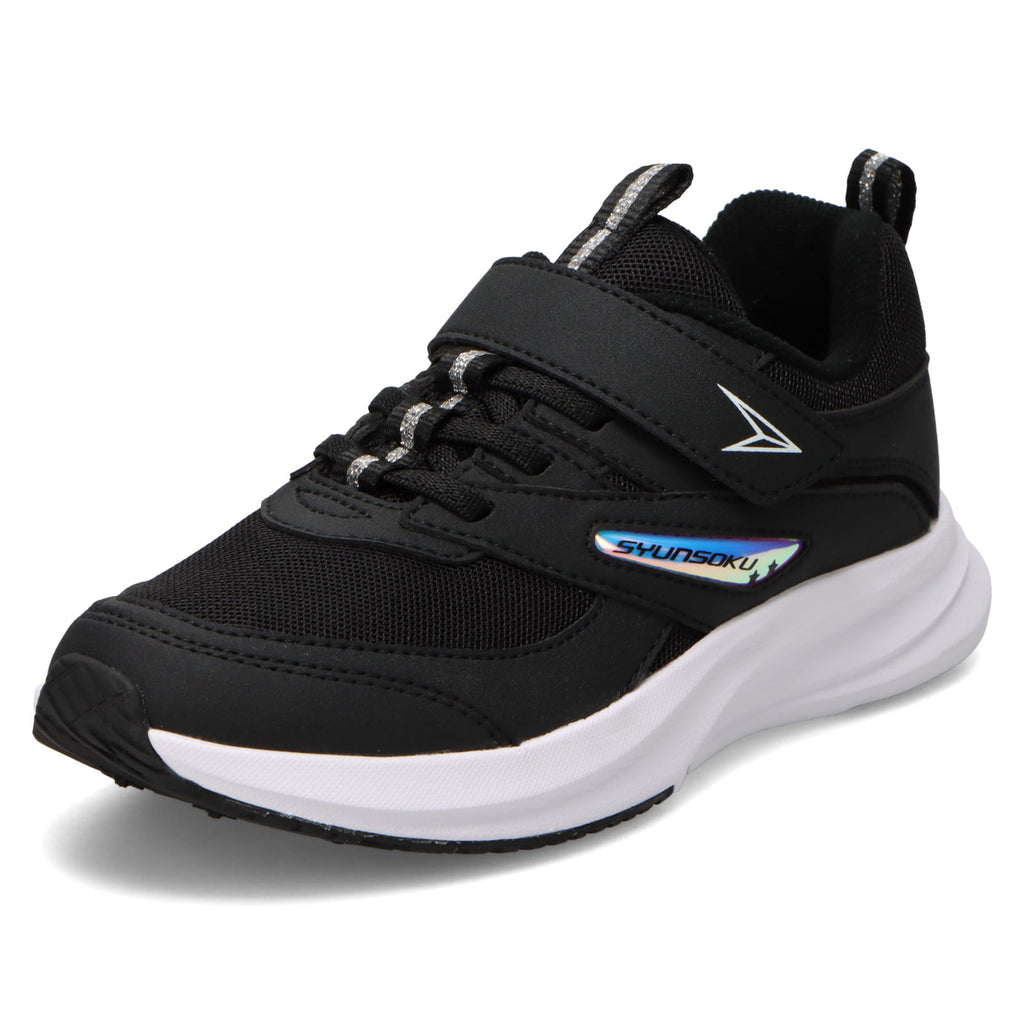 シューレースホルダーや踵のつまみにはシルバーのラメ加工を採用し、角度によってきらめきが変化。さらに、アッパーサイドに配置されたホログラムのSYUNSOKUロゴがシンプルなデザインを引き立てます。