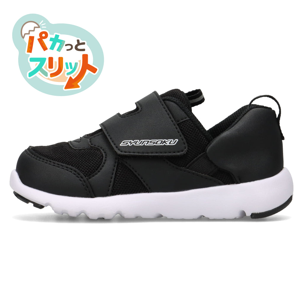 「自分で履きたいけれど、うまくできない」という課題に応える「パカっとスリット構造」を採用。足入れがしやすい設計で、幼い子どもでも簡単に履けます。さらに、両サイドに耐久性のあるフィッティング調整ゴムを採用し、履きやすさだけでなく、かかとにしっかりフィットする機能も備えています。
